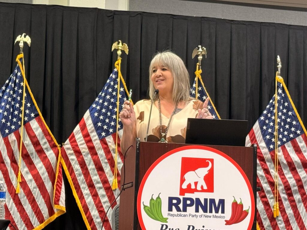 New Mexico GOP Chairwoman Amy Barela speaks at the 2026 NMGOP convention in Ruiodoso / NMGOP