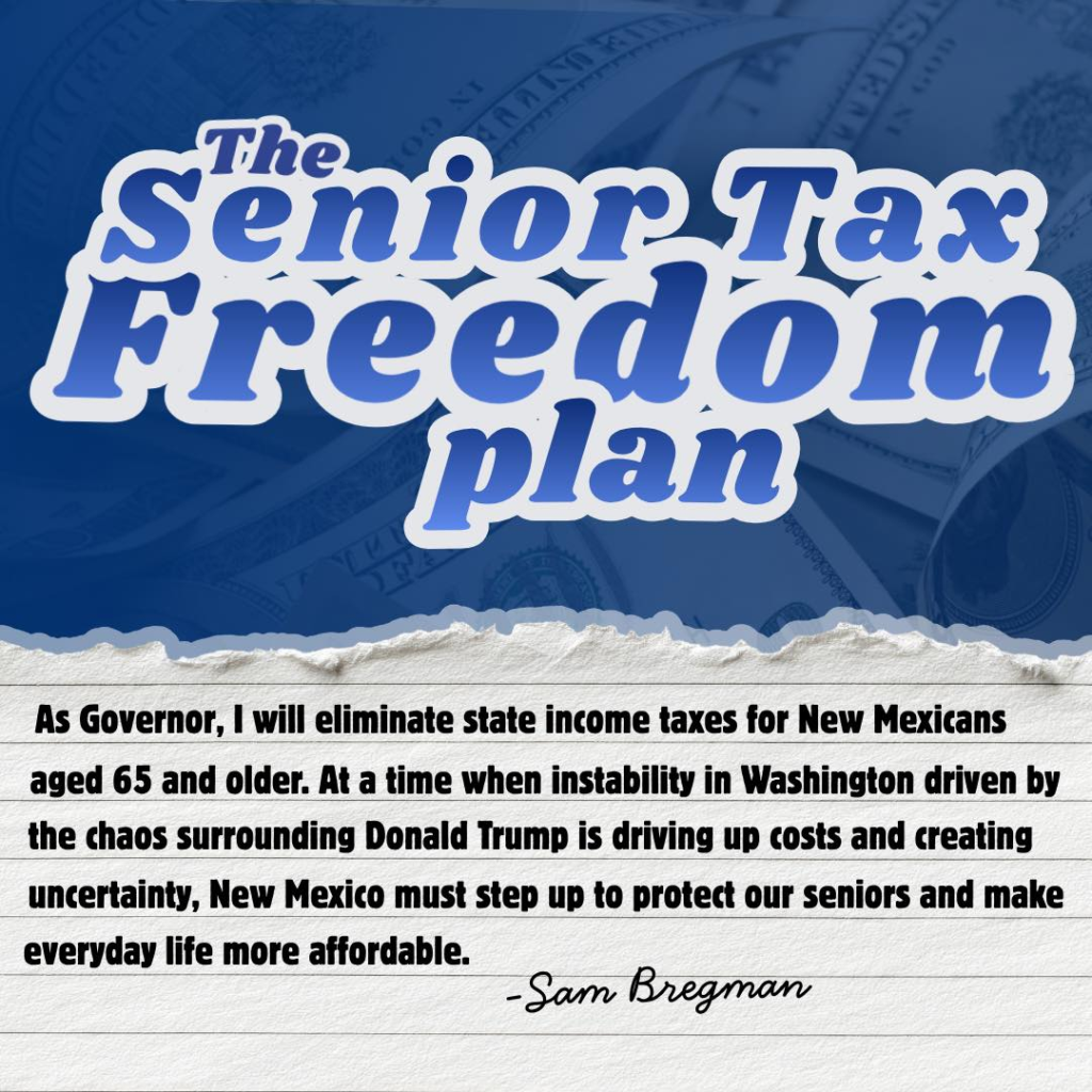 Sam Bregman has a bold idea that he says will make aging easier for New Mexicans. In a new policy pitch announced today, Bregman says he will ask the legislature to totally eliminate state income taxes for New Mexicans aged 65 and older and he plans to pay for it from the state’s record oil and gas revenues and reserves.