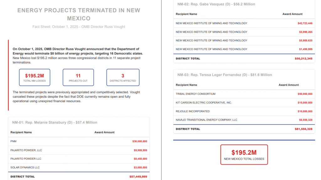All three of New Mexico’s three congressional districts were impacted, with 11 projects related to mining research, renewable energy, and tribal energy initiatives losing funding.