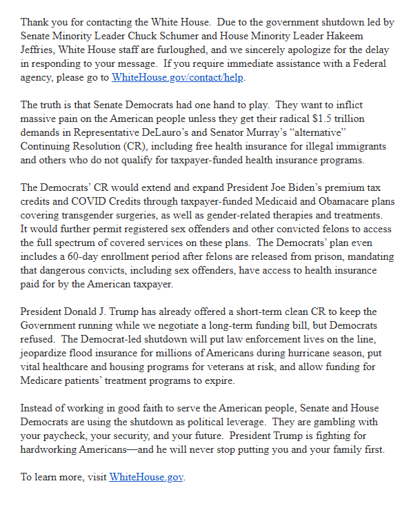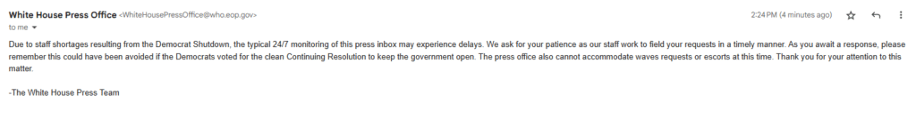 “Due to staff shortages resulting from the Democrat Shutdown, the typical 24/7 monitoring of this press inbox may experience delays. We ask for your patience as our staff work to field your requests in a timely manner. As you await a response, please remember this could have been avoided if the Democrats voted for the clean Continuing Resolution to keep the government open. The press office also cannot accommodate waves requests or escorts at this time. Thank you for your attention to this matter.