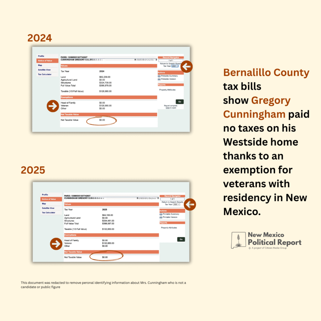Bernalillo County tax records also show the Cunninghams paid zero property taxes in New Mexico in 2024 and 2025 thanks to a property tax exemption available to disabled veterans.