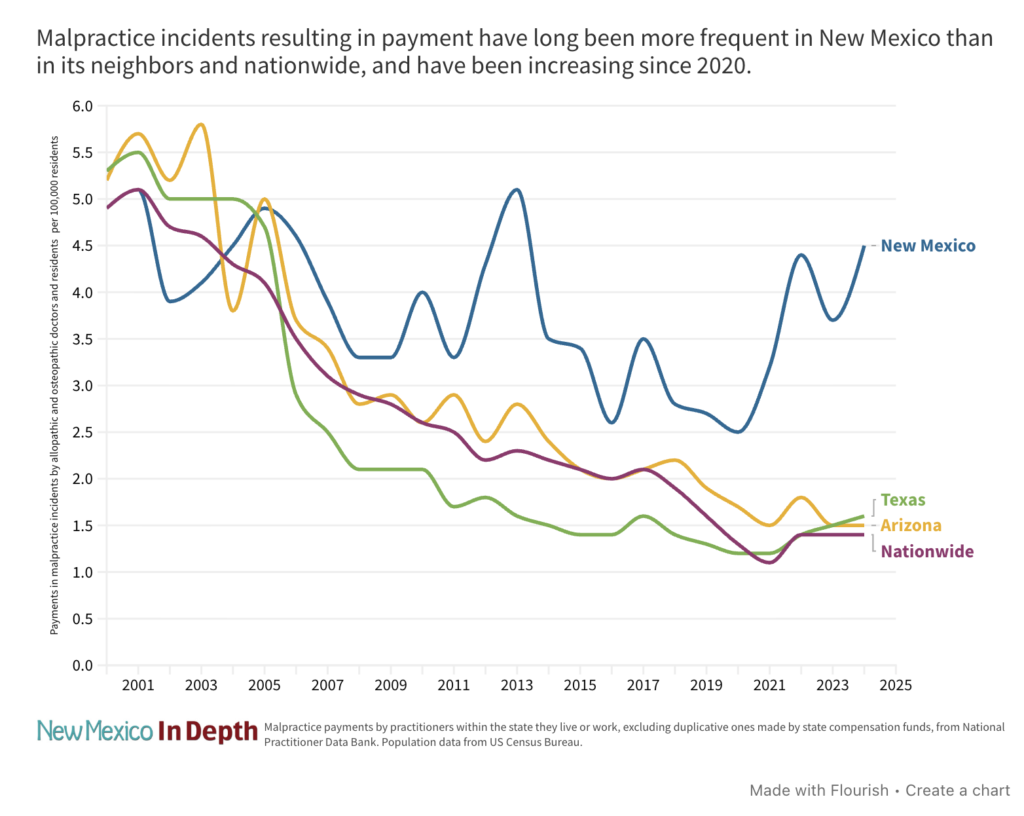 Doctors in the state also pay eye-watering premiums for malpractice insurance, particularly in high-risk specialties. While comparisons with other states are complicated, Superintendent of Insurance Alice Kane told legislators on November 6 that overall, New Mexico clinicians pay about double neighboring states and that premiums have risen by roughly 40% since January 2022.